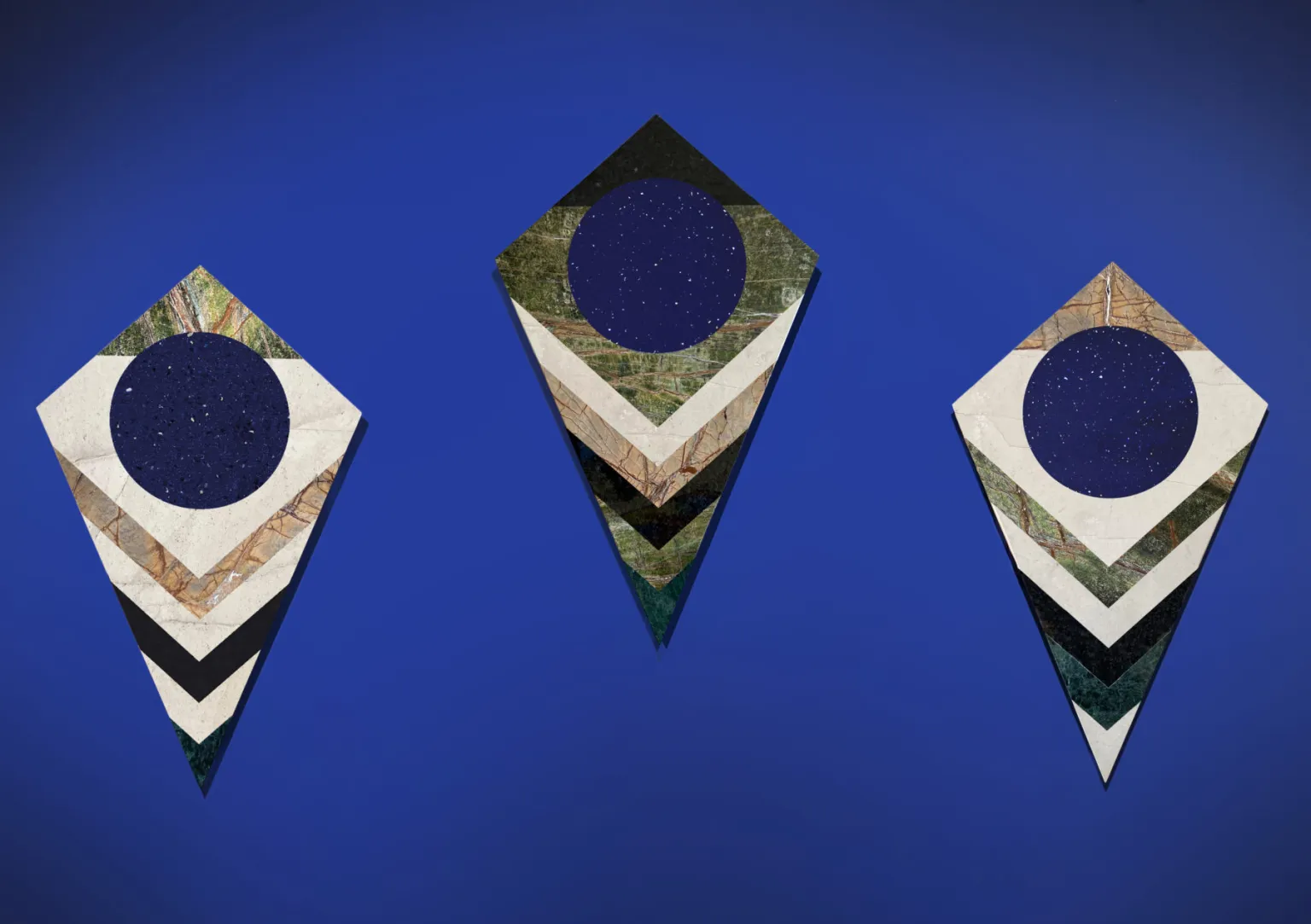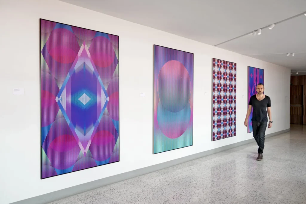 La obra de Israel González Élan se construye desde una práctica multidisciplinaria que combina pintura, técnicas digitales, serigrafía, estampa y collage. A través de estructuras geométricas, ritmos visuales y exploraciones cromáticas, el azul ultramarino se vuelve un elemento constante, ligado al mar, al inconsciente y al cielo como espacio abierto.