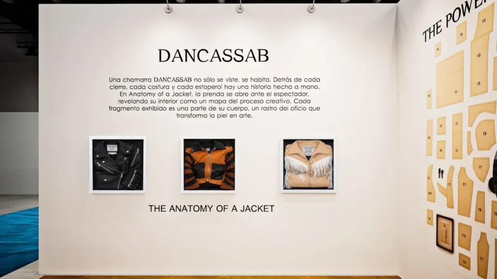 La propuesta parte de una premisa clara: una chamarra, además de usarse, se habita. A través de instalaciones, diagramas y fragmentos, el visitante accede al interior de una pieza DANCASSAB como si se tratara de una cartografía del proceso creativo. Elementos que normalmente permanecen ocultos, como costuras, cierres, forros y aplicaciones, se presentan como protagonistas y revelan el trabajo artesanal que transforma el cuero en un objeto cultural dentro del diseño mexicano.